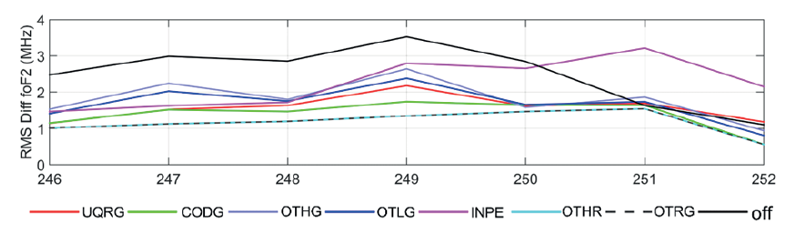 A Figura 2 apresenta os valores de RMS das diferenças entre os valores medidos de foF2 pelas ionossondas e os valores estimados com auxílio dos mapas ionosféricos (globais, regionais e híbrido), bem como a simples diferença entre os valores medidos pelo par de ionossondas CAJ2M-SAA0K. De maneira geral, é possível verificar que os mapas apresentaram desempenho melhor que a opção sem interpolação (off). Os mapas regionais do DGFI-TUM (OTHR e OVHR) apresentaram os menores erros e comportamento mais regular entre os produtos analisados. Os mapas globais apresentaram comportamento semelhante, com melhor desempenho geral do CODG, seguido por UQRG. O produto que apresentou pior desempenho foi o mapa regional do INPE.