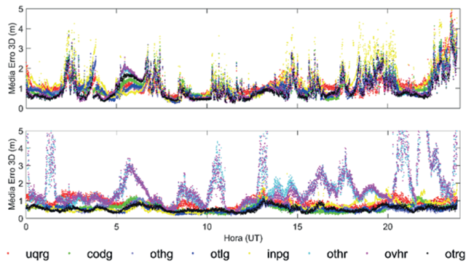 Considerando os valores médios de RMS analisados para um ano de dados (2015), em geral, o melhor desempenho foi obtido pelos produtos do CODE e da UPC. Resultado semelhante pode ser observado na Tabela 1, que apresenta as taxas de melhoria do RMS médio para os produtos finais. As análises foram realizadas considerando, ainda, variações diárias, sazonais, impacto da espessura da ionosfera e uma série temporal de quatro anos (2014-2017).