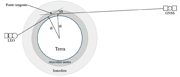 A recuperação de perfis atmosféricos a partir de dados de RO está diretamente relacionada ao conceito de refração. Isso porque a RO é baseada no efeito da atmosfera, que refrata o sinal transmitido, alterando sua velocidade de propagação e, consequentemente, sua trajetória. Devido a essa ação, durante um curto intervalo, o sinal GNSS chega ao receptor instalado no satélite LEO, ainda que o mesmo esteja obstruído pela Terra (Kursinski et al., 2000). Durante uma ocultação, que em geral dura de um a três minutos, com a variação da posição entre os satélites GNSS e LEO, é possível obter um perfil de refração do sinal eletromagnético. A Figura 4 apresenta a geometria de uma ocultação, onde é possível verificar os principais elementos envolvidos: o ângulo de refração (α), o parâmetro de impacto (a) e o raio de tangência (rt), que corresponde à distância entre o centro da Terra e o ponto tangente.