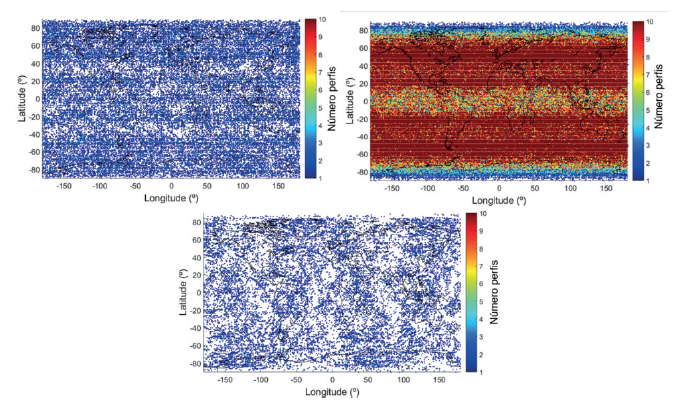 Antes da avaliação das metodologias utilizadas para a recuperação de perfis ionosféricos provenientes de RO, foi desenvolvida uma análise das missões de RO com perfis ionosféricos em relação ao número de perfis e à área de cobertura. As análises consideraram um dia, um mês e um ano de dados, além do período completo de cada missão. A Figura 5 apresenta a plotagem do número de ocorrências de ocultações com perfis ionosféricos para um mês de dados. A plotagem à esquerda corresponde a dados da missão CHAMP, a do centro à missão COSMIC e a da direita à missão GRACE. Para a obtenção das imagens foi considerado um grid de 1º x 1º (latitude x longitude). Com esses resultados fica evidente a maior concentração de perfis disponibilizados a partir da missão COSMIC. Além disso, verifica-se que para esta missão a maior quantidade de ocultações tem ocorrência em regiões de médias latitudes, diferente do observado para as missões CHAMP e GRACE.
