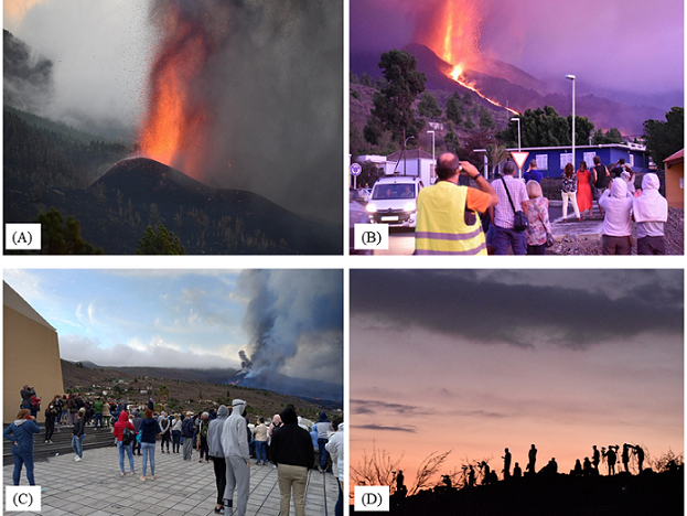 Figura 1 Interés turístico del volcán: (A) columna eruptiva del volcán Tajogaite. (B y C) visitantes observando la erupción del volcán Tajogaite (septiembre-diciembre, 2021). (D) periodistas fotografiando la erupción por la noche.