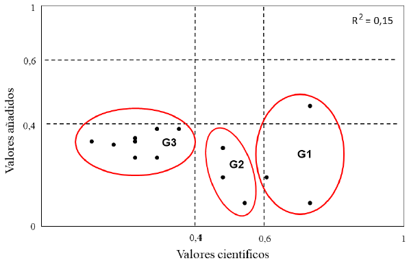 Al relacionar los valores científicos con los añadidos (Figura 6), a pesar de poseer correlación baja o nula, el enfrentamiento entre ambos grupos de valores permite identificar tres grandes grupos de geomorfositios. G1: corresponde a aquellos que disponen de valores científicos altos y valoraciones añadidas bajas o medias y que suman el 18.7% del total con tres lugares (cono del volcán Tajogaite, fisuras eruptivas 2021 y lavas pāhoehoe 2021). G2: es el que dispone de valoraciones científicas y añadidas medias, que agrupa a tres geomorfositios (hornitos 2021, lavas 'A'ã 2021 y delta lávico de 2021) que suponen el 18.7% del total. Y, por último, el grupo G3: constituido por diez geomorfositios que corresponde con los que cuentan con valores científicos y añadidos bajos y que constituyen el 60.6% de los lugares estudiados. Se puede observar que los seis geomorfositios generados durante la erupción de 2021 son los que se engloban en los dos primeros grupos, mientras que en el tercero están los lugares generados previamente al paroxismo eruptivo de 2021.