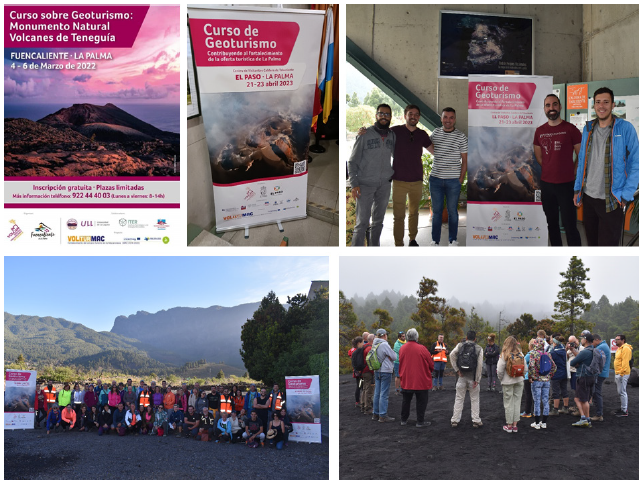 Figura 7 Cursos de geoturismo para la formación de guías de empresas de turismo activo: cartelería, profesorado, alumnado y trabajos de campo.