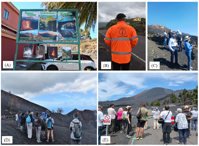 Figura 8 Carteles (A), guías del volcán (B) y visitantes en varios de los puntos habilitados para ello: (C) Mirador de Tacande, (D) sendero próximo al cono volcánico y (E) Carretera San Nicolás- Las Manchas.