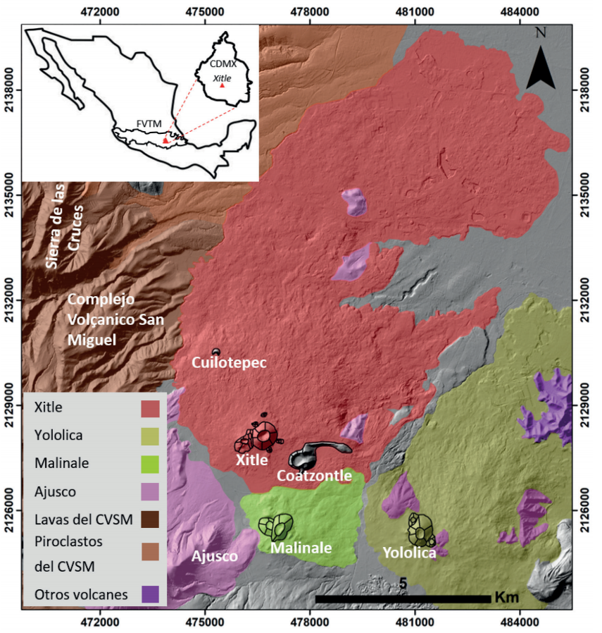 En el área se encuentran varios volcanes monogenéticos anteriores al Xitle, uno es el volcán Cuilotepec, que es un cono de escorias con una edad estimada de >4,840 años A.P. Su cono y derrames de lava fueron cubiertos en gran parte por las lavas del Xitle (Martin Del Pozzo, 1990; Nieto y Martin Del Pozzo, 2019). Martin Del Pozzo, (1982) estimó una edad de alrededor de 30,500 años A.P. para el Volcán Coatzontle por correlación morfológica con las edades publicadas por Bloomfield (1975). Sus derrames de lava y ceniza se encuentran cubiertos por las lavas del Xitle, sobresaliendo únicamente parte de su cono y un grueso derrame de lava. Los derrames del volcán Yololica, que produjo andesitas basálticas fluidas también están en contacto con los derrames del Xitle. Al sur del volcán Xitle se encuentra el volcán Malinale y sus derrames andesíticos que fueron datados por radiocarbono en 18,900 ± 600 años A.P (Kirianov, et al.,1990; Figura 1).