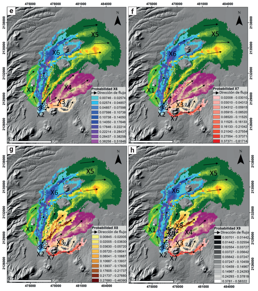 Los valores más altos de probabilidad por inundación de lava simulada (0.5839 se muestran en color blanco (Figura 10H).