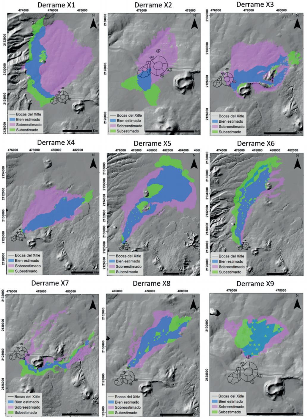 En cuanto a las estimaciones de cada derrame de lava simulado se obtuvo que la sobreestimación es alta en los derrames X1, X2, X3, X4 y X7. Esto se debe a que los primeros cuatro derrames de lava que se observan en la topografía actual no están completos, es decir que no es visible la parte cubierta y enterrada por los derrames de lava posteriores (X5, X6, X8 y X9). Es posible que en realidad la parte sobreestimada de los primeros cuatro derrames de lava no sea tan grande y la simulación de estos derrames de lava sea más certera. El valor de sobreestimación para el derrame X7 es ligeramente alto, debido a que la parte que viajó al norte, está enterrada por los derrames X8 y X9, por lo que no podemos verla actualmente. Estos valores altos de sobreestimación se explican también porque las áreas con las que se compararon los derrames de lava simulados fueron las de los derrames reales que se pueden observar actualmente en campo. Esto se refleja en los resultados de la sobreestimación, sobre todo para los primeros derrames de lava que son los que se encuentran más cubiertos por los últimos derrames de lava emplazados.