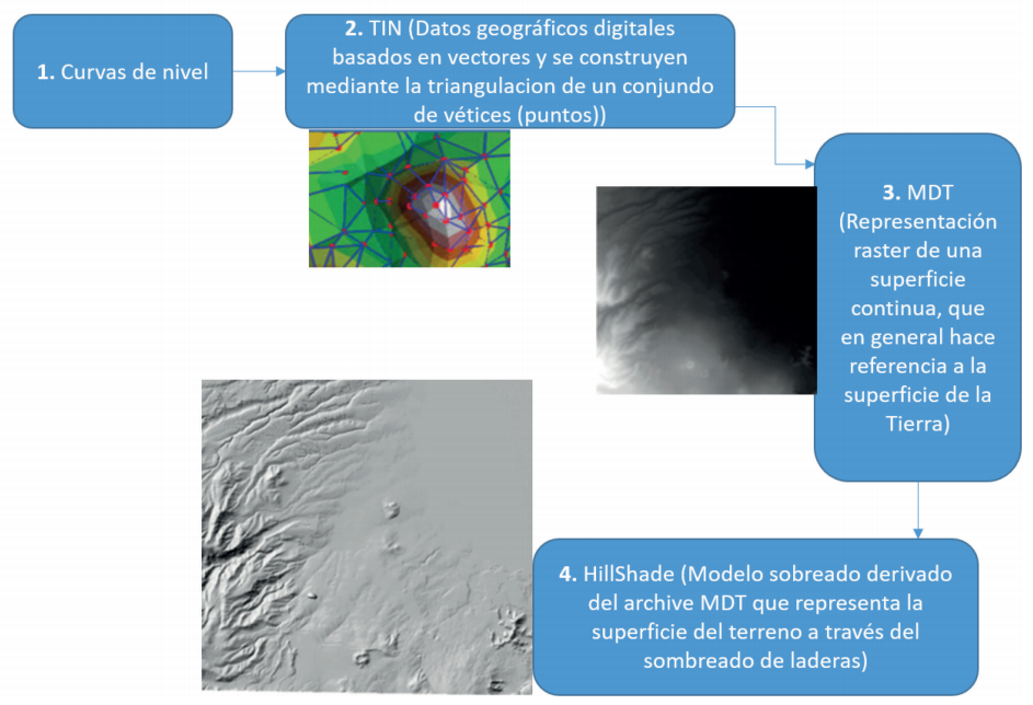 La reconstrucción del paleo-relieve del área del volcán Xitle se llevó a cabo en el programa SIG ArcGIS 10.4, con las nuevas curvas de nivel modificadas del relieve actual (Figura 4A), sin los derrames de lava del Xitle. Los vértices que conforman cada curva de nivel del relieve actual del Xitle, se modificaron de acuerdo a la morfología del relieve preexistente, que se investigó en trabajos publicados, en las imágenes satelitales y en el MDT, constatado con el trabajo de campo. Con este procesamiento de información, se obtuvieron las nuevas curvas de nivel con las características del relieve pre-existente. Se hizo una Red Irregular Triangular (TIN por sus siglas en inglés) a partir de las nuevas curvas de nivel. El TIN es una forma de datos geográficos digitales basadas en vectores que se construye mediante la triangulación de los vértices (puntos) de las curvas de nivel. A partir del TIN se creó una nueva superficie ráster (MDT) y se creó un HillShade (mapa de sombras) con resolución de 10 m que contiene las características del paleo-relieve (Figura 2).