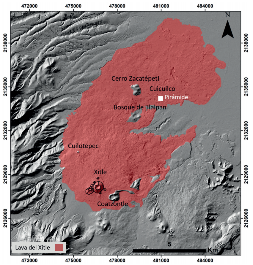 En el MDT del relieve actual de la zona del volcán Xitle destacan las estructuras que fueron parcialmente cubiertas por sus derrames de lava. Estas estructuras son los volcanes Cuilotepec y Coatzontle, y los montículos (hummocks) del volcán Ajusco como el cerro Zacatépetl y el Bosque de Tlalpan, así como la pirámide de Cuicuilco (Figura 3).