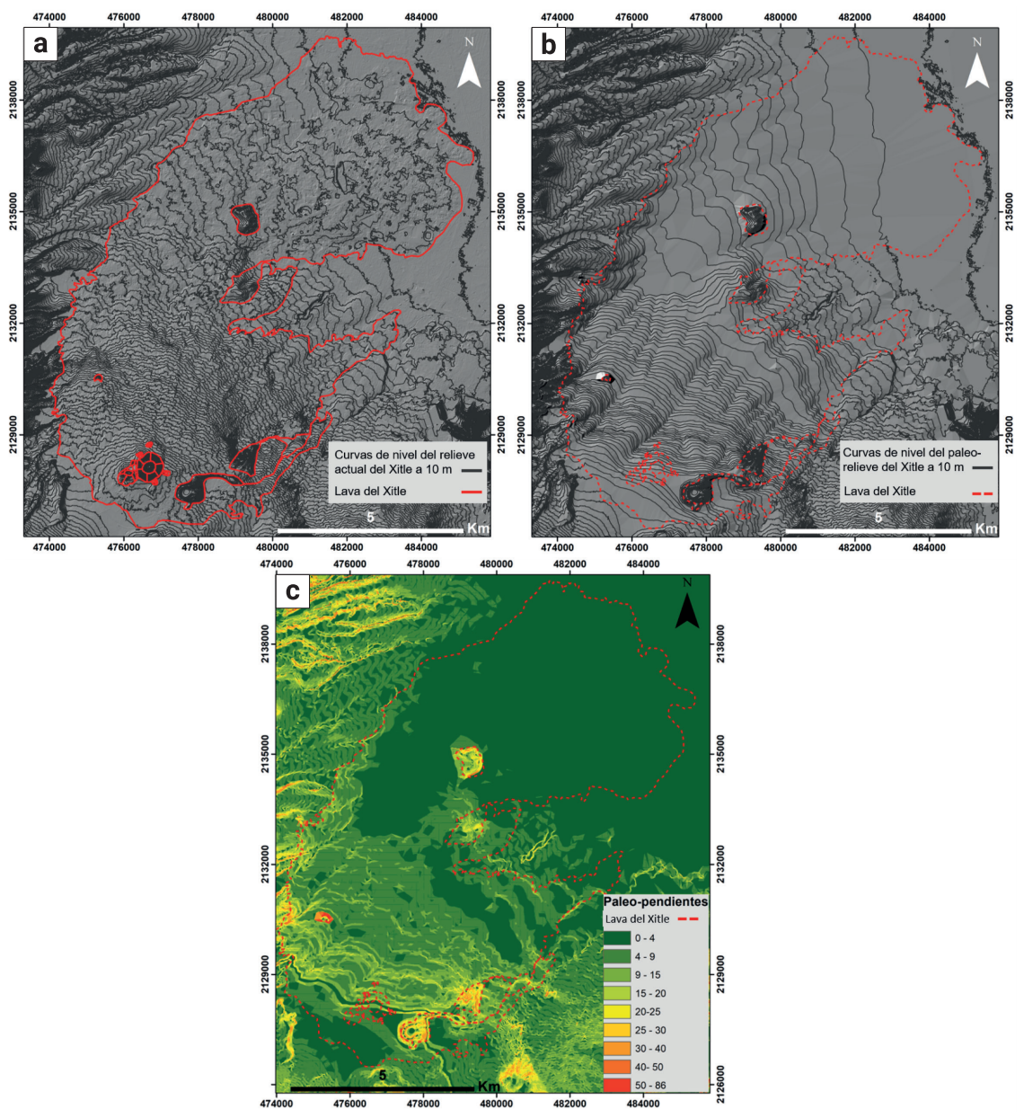 A partir de datos LiDAR (Light Detection And Ranging) de INEGI, en el programa SIG ArcGIS 10.4 se construyó un Modelo Digital de Elevación para obtener el relieve actual de la zona cono del volcán Xitle y sus derrames de lava con una resolución de 5 m. Se construyeron manualmente las curvas de nivel cada 10 m con el propósito de eliminar el efecto de los derrames de lava del volcán Xitle de la topografía actual y reconstruir el relieve preexistente (paleo-relieve). Esto se realizó modificando los vértices de las curvas de nivel siguiendo la topografía de los depósitos de los volcanes pre-Xitle.
