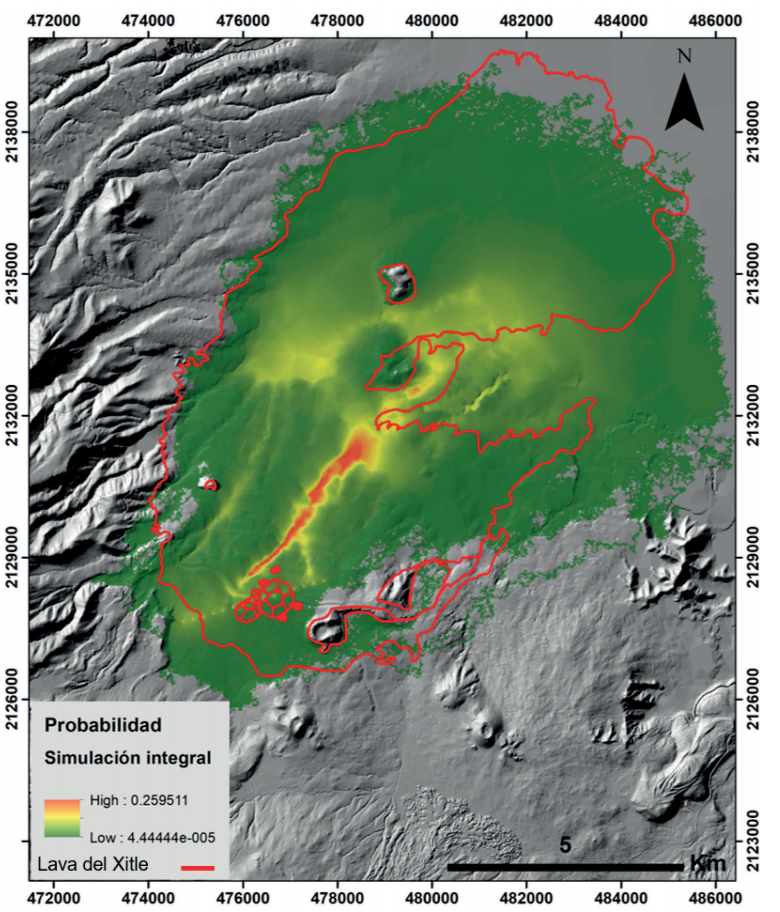 En la simulación integral de los derrames de lava total del Xitle se considera que toda la lava se emplazó en un único evento. Los colores indican la probabilidad de inundación (Figura 5). El color rojo indica los lugares con mayor probabilidad de ser inundado por el derrame de lava simulado, mientras que el color verde obscuro indica los lugares donde la probabilidad de inundación por la lava simulada fue menor.