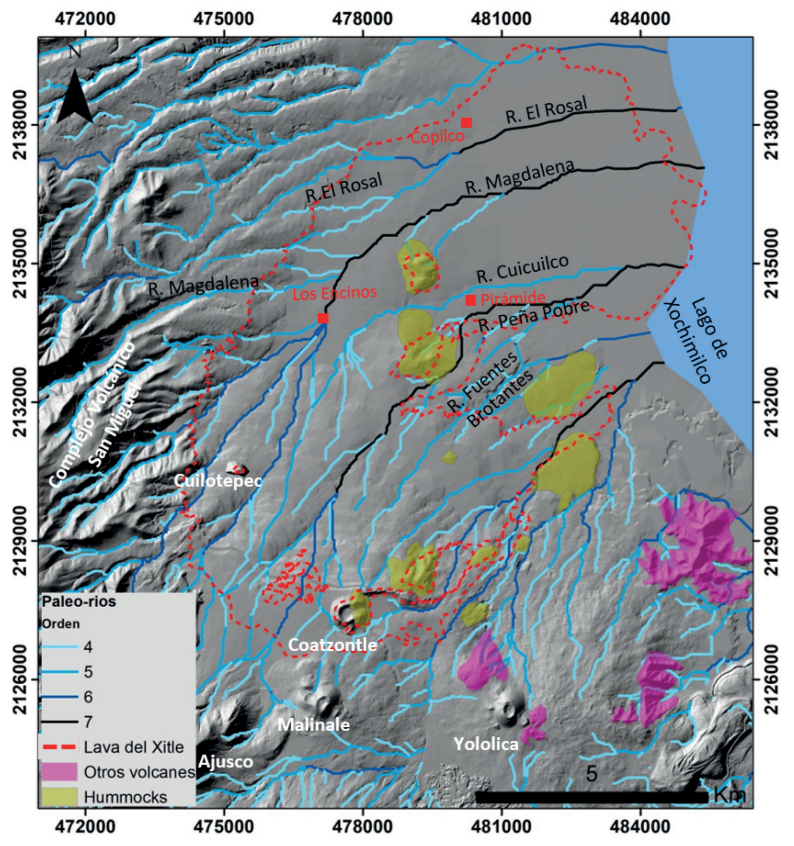 La reconstrucción de los paleo-ríos en el paleo-relieve muestra que antes de la erupción del volcán Xitle la zona tenía una compleja red de drenaje, con ríos de orden 1 a 7. Los paleo-ríos principales son los de mayor orden (4, 5, 6 y 7), que fueron los que controlaron el emplazamiento de los derrames de lava del Xitle (Figura 6). El agua escurría por las abruptas pendientes de la Sierra de las Cruces, principalmente del Complejo Volcánico San Miguel, del volcán Ajusco y por los derrames de lava de los volcanes monogenéticos pre-Xitle. Los paleo-ríos principales desembocaban en el antiguo Lago de Xochimilco.