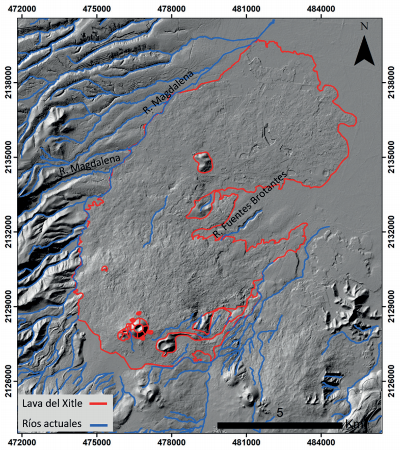 Cordova et al. (1994) y Martin Del Pozzo et al. (1997) identificaron cinco paleoformas del terreno que actualmente se encuentran cubiertas por las lavas del Xitle: lavas basálticas y andesíticas del pleistoceno y holoceno del CVMC; piedemontes altos (e.g. Cerro Zacatépetl), piedemontes bajos (abanicos aluviales), planicies (depósitos lacustres) y paleo-ríos. Cordova et al. (1994) propusieron que los ríos antiguos El Rosal, Magdalena, Cuicuilco, Peña Pobre y Fuentes Brotantes formaban los ríos pre-Xitle. Los autores hicieron estos estudios basándose en la relación entre el espesor de la lava, la textura del suelo, la litología y la proyección del relieve en el área cubierta por los derrames de lava del Xitle.