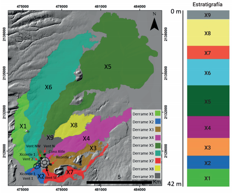Trabajos anteriores no reportaron los dos últimos derrames de lava de tipo aa (X8 y X9) (Delgado-Granados et al., 1998 y Siebe, 2000). En el paleo-relieve reconstruido se simularon 9 derrames de lava del volcán Xitle mapeados en campo.