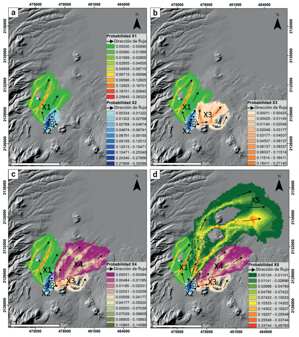 El derrame que se muestra en verde se originó de la Boca 1 del Xicontle 1. Se emitió inicialmente como lava pahoehoe y cambió a lava aa debido a un aumento en la tasa de efusión y a que este derrame se movió desde la pendiente pronunciada del paleo-relieve hasta terreno plano. Este derrame de lava cubrió un área de 14.57 km2 y su volumen final fue de ~0.058 km3. Al inicio el derrame de lava tomó dirección hacia el oeste y el norte bajando por los canales de los afluentes de los paleo-ríos Peña Pobre, Cuicuilco y Magdalena. Este derrame X1 cambió de dirección hacia el nor-noreste cuando llegó a la zona de lavas y lahares del Complejo Volcánico San Miguel emplazándose por los paleo-canales del paleo-río Magdalena, cubriendo parcialmente al volcán Cuilotepec y a sus derrames de lava. Los valores más altos de probabilidad de inundación por lava se muestran en color rojo (0.263), donde se encontraban los paleo-ríos, mientras que las de color verde representan los valores más bajos (0.000306) (Figura 9A).