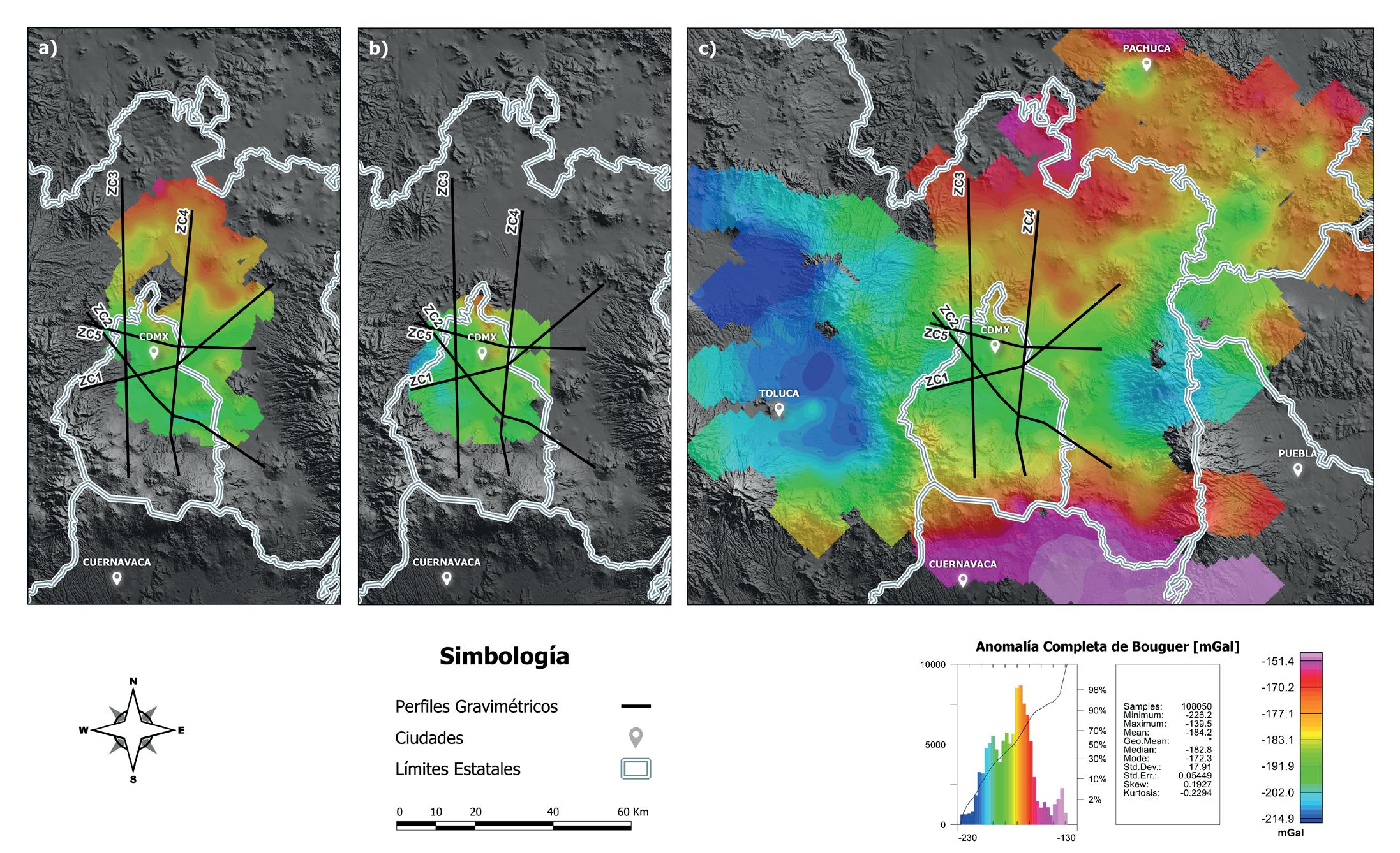 La Anomalía Completa de Bouguer presenta valores desde -226.1555 hasta -139.5078 mgal. Los valores altos se presentan en la zona norte de Morelos y poniente de Puebla, regiones que delimitan el sur de la CM, también se determinaron valores altos al norte de la ZMCM y nororiente de la CM. Esta estructura regional asemeja una franja horizontal de mínimo gravimétrico con rumbo E-W que se hace más angosta al centro de la CM. En la zona urbana de la CDMX se observa una estructura local de rumbo N-S de mayor respuesta gravimétrica que va desde el Cerro de la Estrella y se extiende hasta la Sierra de Guadalupe, dando continuidad con los altos gravimétricos al norte de la CM.