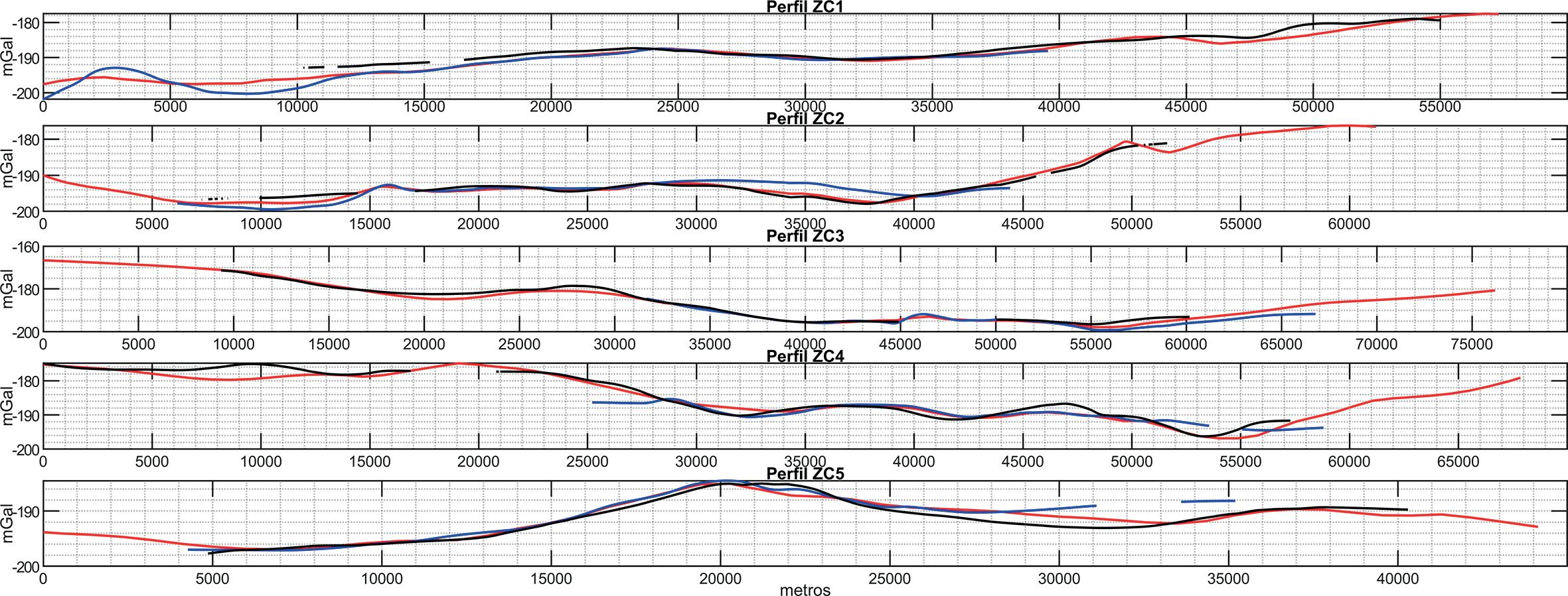 Figura 11. Comparación entre los antecedentes de mediciones gravimétricas dentro de la CM respecto a la actual Campaña GTM2024. a) Perfil ZC1, b) Perfil ZC2, c) Perfil ZC3, d) Perfil ZC4, e) Perfil ZC5. Las líneas de color rojo son de la Campaña GTM2024, las líneas de color azul son de las mediciones de JICA de 1989 y las líneas de color negro son de las mediciones de 1953.