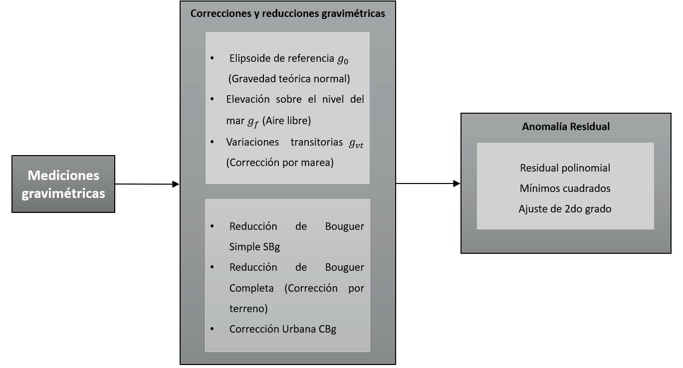 El estudio geofísico abarcó completamente el territorio de la CDMX, gran parte del Estado de México y áreas colindantes de los estados de Morelos, Tlaxcala e Hidalgo. La realización de las mediciones gravimétricas representó un gran reto debido al continuo y caótico tránsito automotriz, la cobertura de infraestructura urbana y la sobrepoblación que está asentada en la ZMCM. A estos datos se les aplicaron las correcciones y reducciones gravimétricas necesarias, como: reducción de la gravedad teórica normal, corrección por aire libre y marea, reducción de Bouguer con correcciones de terreno y urbana. También se calculó una anomalía residual de segundo grado para lograr una mejor interpretación de los resultados. El flujo de procesamiento de los datos gravimétricos se muestra en el siguiente diagrama (Figura 3):