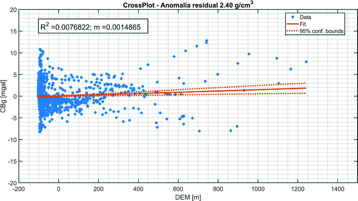 Esta reducción del efecto isostático se obtuvo mediante el uso de anomalías residuales ( Caratori et al., 2007), aplicando un filtro Butterworth pasa-altas (longitud de onda de 65 km). El análisis comparativo consideró múltiples correcciones de Bouguer aplicando densidades entre 2.2 y 2.67 g/cm³. La evaluación mediante gráficas de dispersión (Cross-Plots: anomalía vs. topografía) mostró que la densidad óptima para esta región fue de 2.4 g/cm³ (Figura 4).