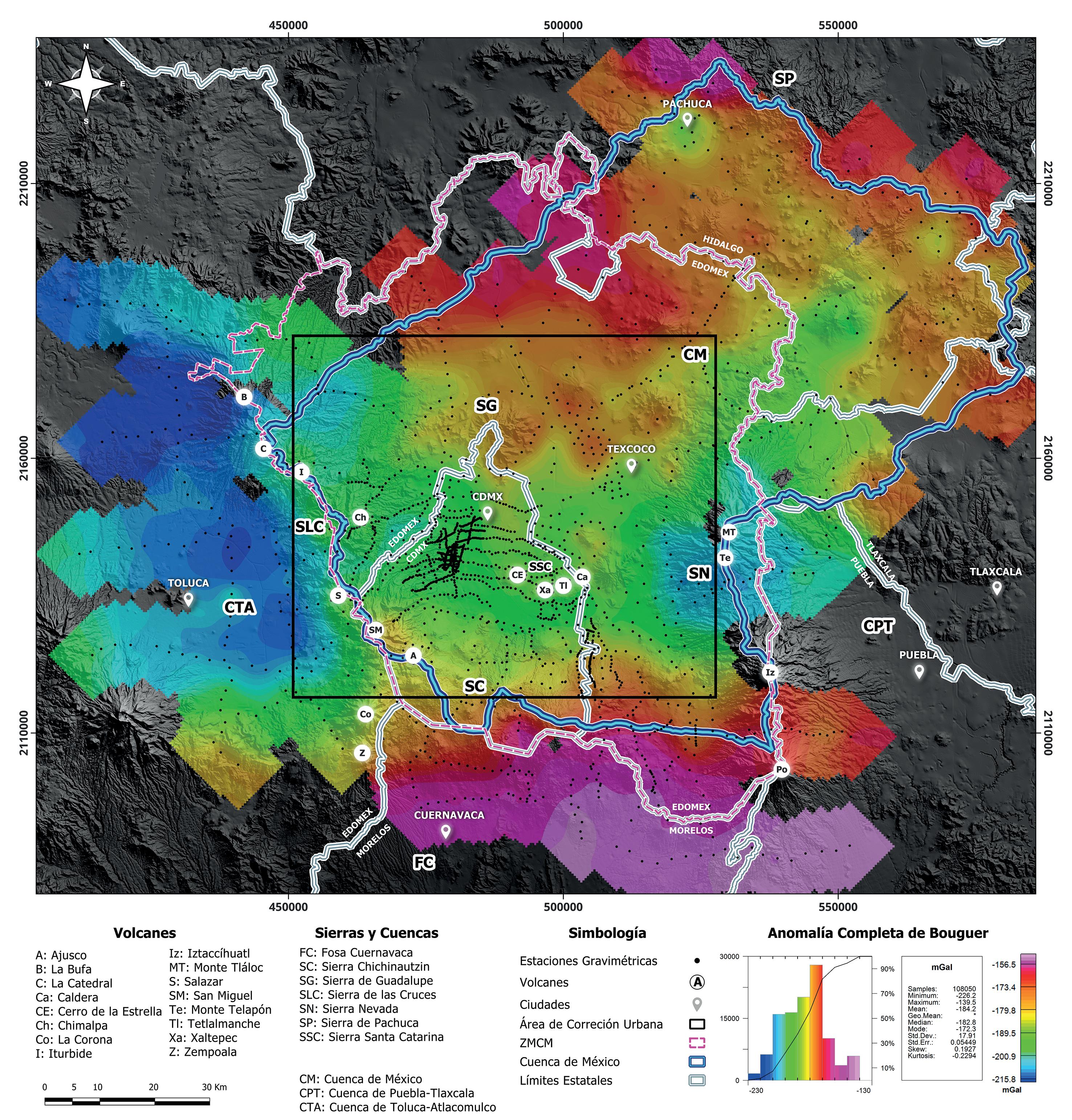 Se observa adicionalmente la existencia de una notable zona de mínimo gravimétrico en la CTA, ubicada al poniente del Estado de México, la cual se acentúa hacia el norte. Esta zona constituye el límite occidental de la CM y está delimitada al oriente por la Sierra de las Cruces. Se observa también una zona con bajos valores gravimétricos al oriente del Estado de México y norte de Puebla, en los alrededores de los montes Tláloc y Telapón. Los valores intermedios se observan prácticamente en toda la CDMX y las zonas aledañas del Estado de México, dando continuidad a los mínimos que se encuentran alrededor del Monte Tláloc y de la CTA.