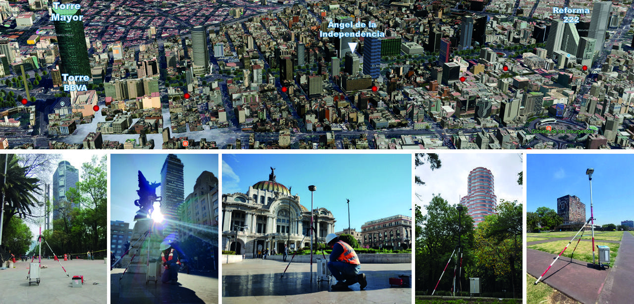 Figura 6. Grandes edificaciones de la CDMX. Los puntos en rojo en la imagen superior muestran algunas de las estaciones gravimétricas de la Campaña GTM2024.