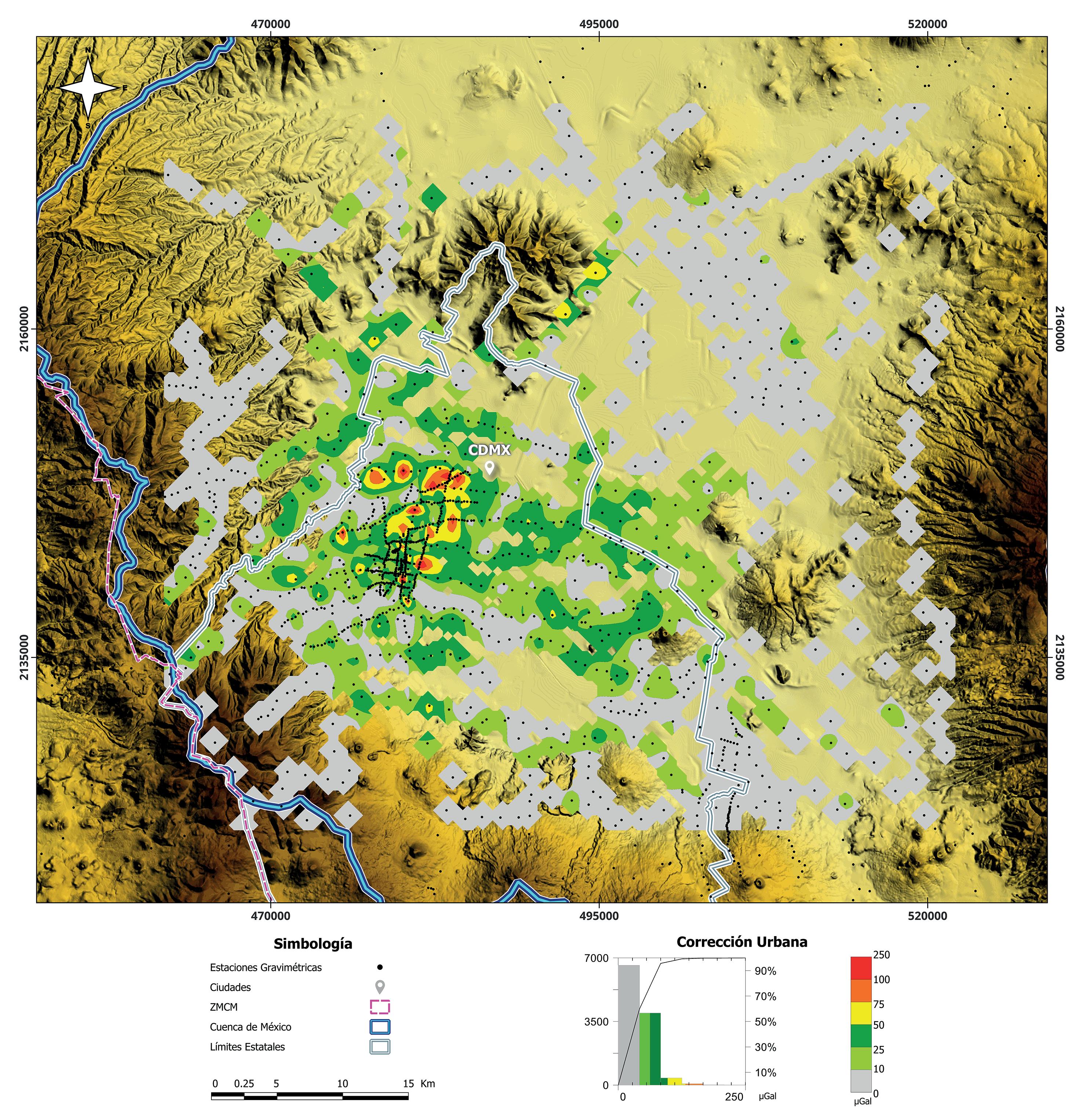 La corrección urbana presenta un rango desde 0 hasta 250 µgal, cuyos máximos se encuentran en las zonas centro y poniente de la urbe, coincidente con las grandes edificaciones de la zona de Polanco y Avenida Reforma. También, existen altos valores en los alrededores de edificios que se encuentran en las avenidas Revolución, Insurgentes y del poniente de Periférico. El resto de la zona urbana de la CDMX tiene valores intermedios cercanos a 50 µgal, mientras que el resto de la zona de análisis tiene valores cercanos a cero.