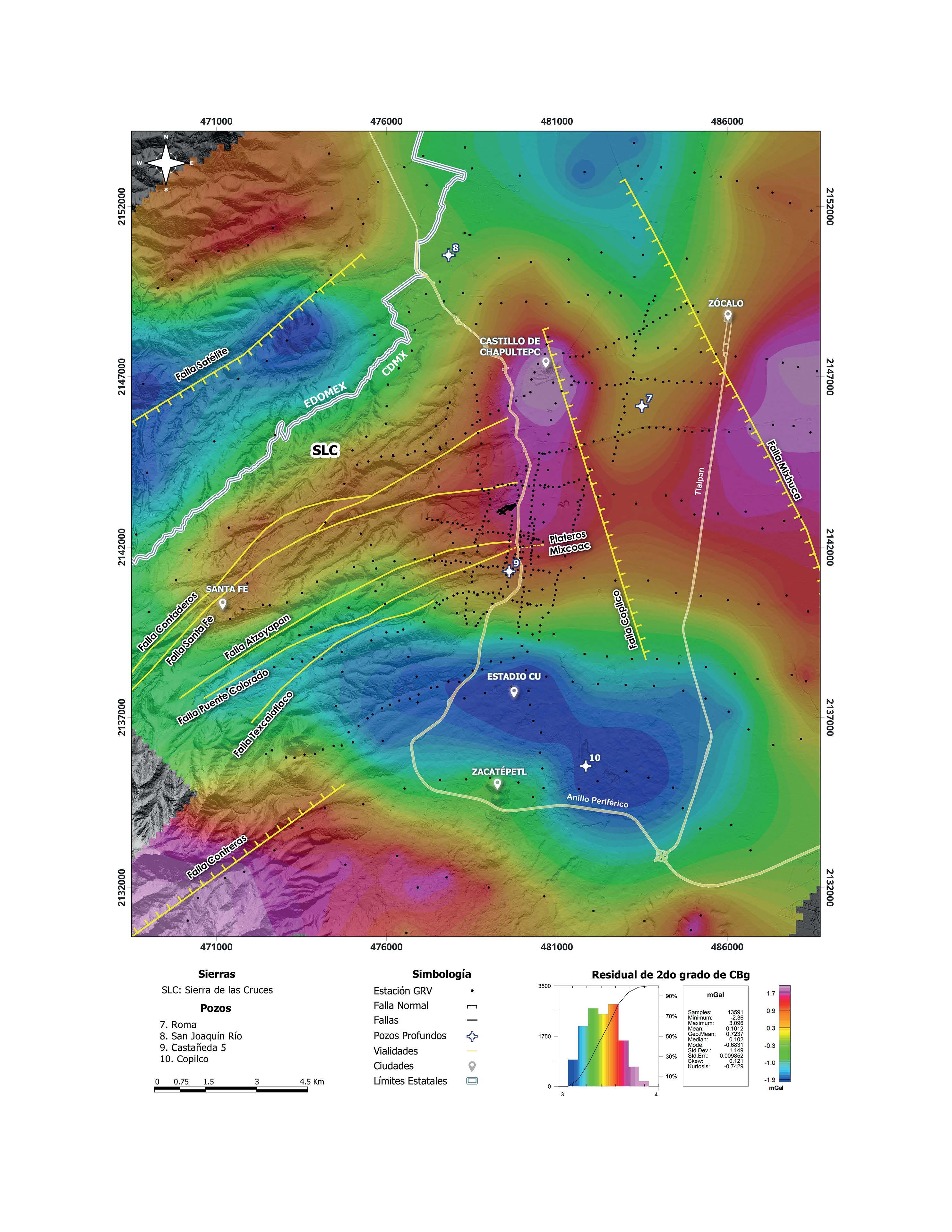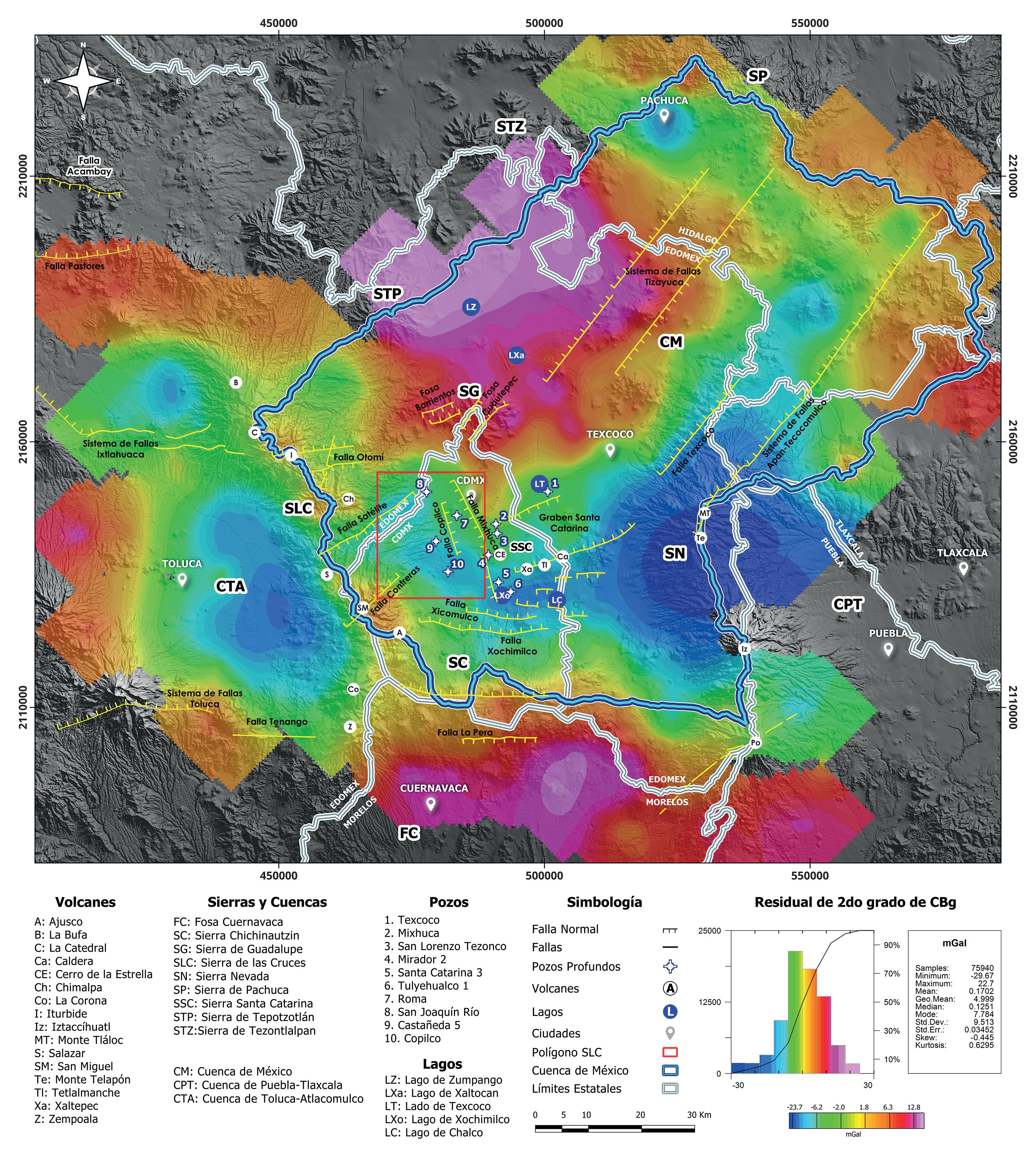 A escala local se define también una estructura determinada por un máximo gravimétrico de rumbo N-S y que se extiende desde el Cerro de la Estrella hasta la Sierra de Guadalupe. Este borde inicia en las estribaciones del máximo gravimétrico de las fosas de Cuautepec y Barrientos hacia los límites con el Estado de México en la Sierra de Tepotzotlán y del estado de Hidalgo, en la Sierra de Tezontlalpan. Es notable el centro de la CM, donde la distribución gravimétrica de valores bajos se vuelve más pronunciada en los alrededores de los montes Tláloc y Telapón, y acotada por el sistema de fallas Texcoco hasta el Graben de Santa Catarina, un mínimo gravimétrico que se extiende al NE a lo largo del Sistema de Fallas Apan-Texocomulco, en la zona del Lago de Texcoco y hacia el estado de Hidalgo. En el caso de la zona de lagos de Chalco y Xochimilco, el bajo gravimétrico, asociado a la depresión interior, está delimitado al sur por el Sistema de Fallas Xochimilco-Xicomulco, mientras que el borde norte corresponde a la extensión de la Sierra de Santa Catarina, que aloja a los volcanes de Xaltepec, Tetlalmanche y La Caldera. Hacia el borde poniente del bajo gravimétrico en el centro de la CM, el análisis del registro estratigráfico desarrollado por Gonzales Torres et al. (2015), señala que la secuencia volcánica y vulcanoclástica en el pozo Roma no alcanza el contacto con la secuencia calcárea Cretácica a 3,220 m de profundidad, mientras que el Pozo Mixhuca (2,060 m), al oriente de la Falla Mixhuca, cortó los sedimentos marinos del Cretácico a ≈1,600 m de profundidad. Algo similar ocurre en los pozos Texcoco y San Lorenzo Tezonco, donde la secuencia calcárea no fue cortada a 2,065 m y ≈ 2,000 m de profundidad, respectivamente, mientras que, en el Pozo Mixhuca, en el borde del alto gravimétrico, el contacto con la secuencia Cretácica fue registrado a ≈1,600 m de profundidad.