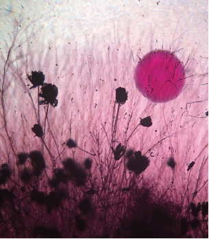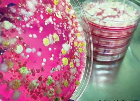 Ellin Thomas utiliza las placas de Petri como marco para sus obras de arte, con ayuda de bacterias y hongos. Coloca una base de lana afieltrada, agrega algunos bordados y deja que las bacterias y los hongos trabajen7.