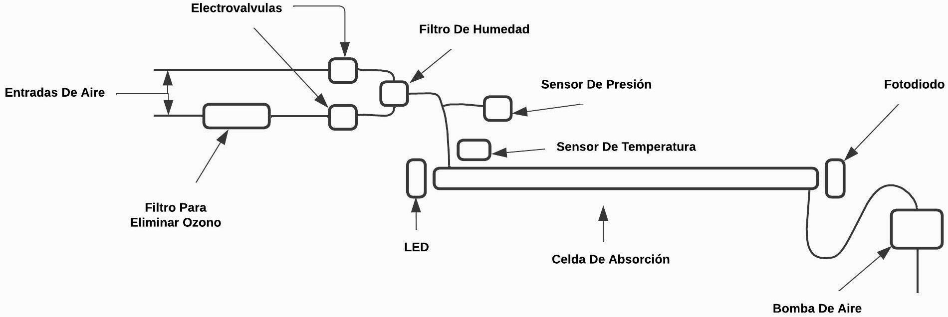 Este sistema, al tener solo una celda de absorción, necesita un arreglo de electroválvulas para poder generar las dos entradas de las muestras de aire requeridas. Una de ellas cuenta con un filtro que elimina el ozono presente en el aire que ingresa por ahí, por la otra entrada fluirá aire tal y como está en el ambiente. Según el tipo de muestra que se necesita para la medición se elegirá la entrada de aire correcta, esto se realiza activando o desactivando alguna(s) de las electroválvulas(s) presentes en el sistema. El flujo de aire es generado por una bomba colocada en el otro extremo de la celda. Los LED’s o Fotodiodos se montan en unas tapas que pueden unirse a los extremos de la celda. También se incluyen los aditamentos necesarios para colocar los sensores utilizados.