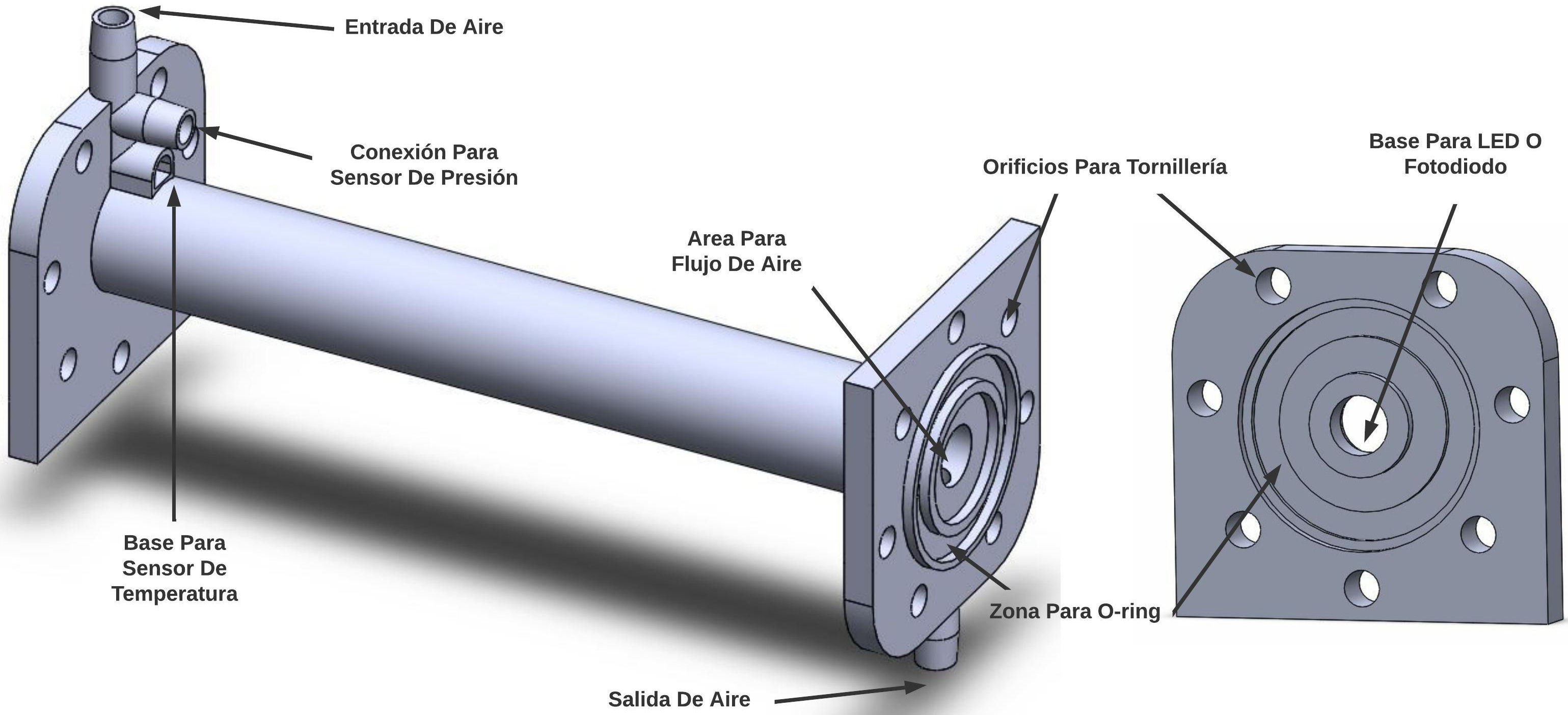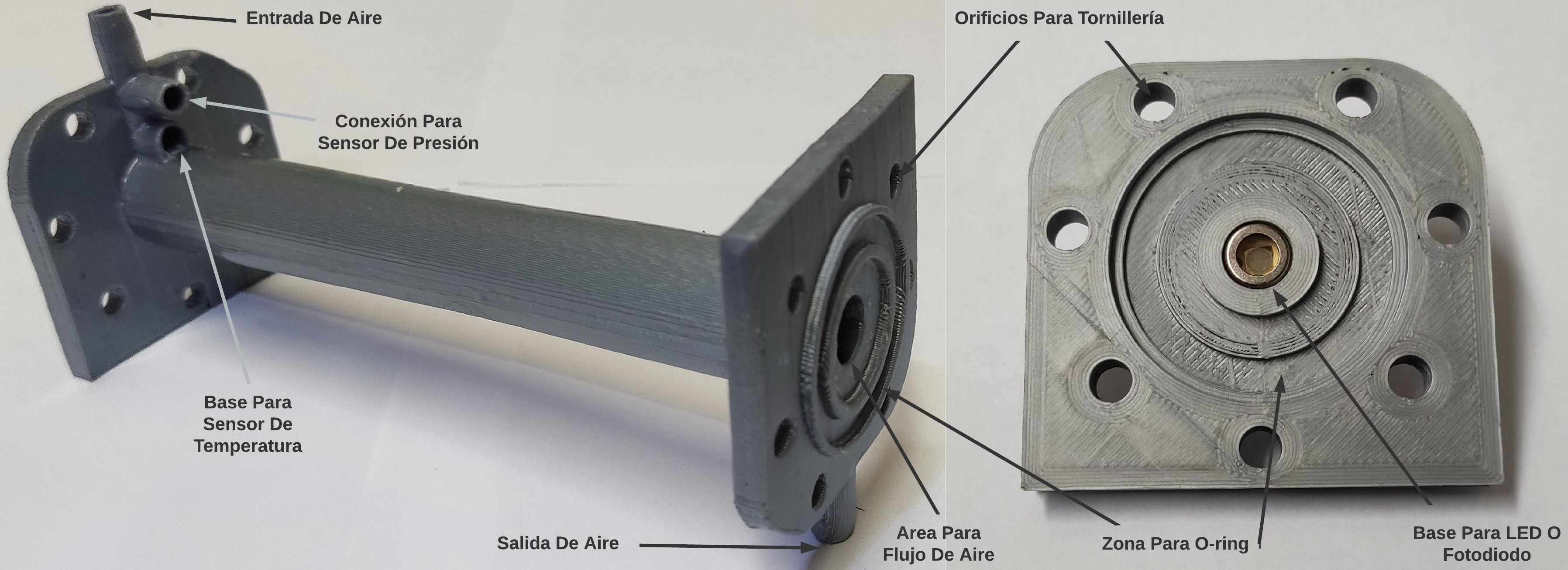Debido a las facilidades que brinda la impresión 3D se pudo integrar una conexión para el sensor de presión evitando el uso de coples externos, también el sensor de temperatura se pudo integrar en un lugar especial y no requirió un soporte especial para sostenerlo.