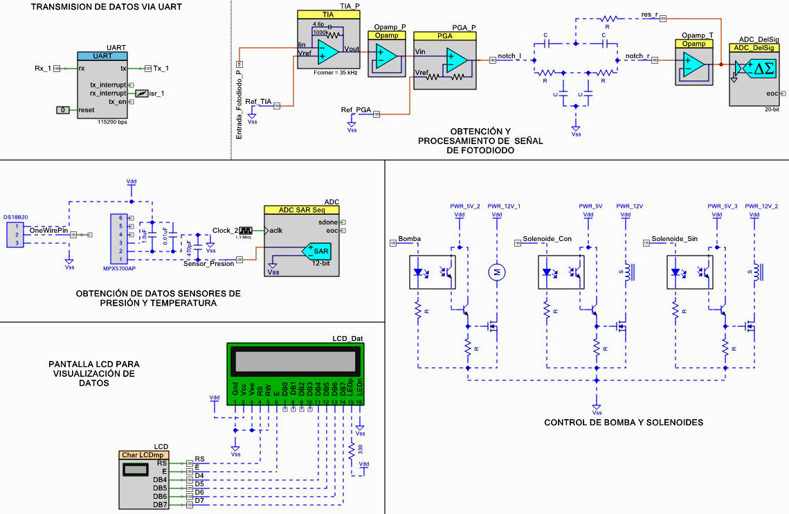 La programación (Fig. 3), se realizó en el software PSoC Creator 4.4 (Infineon Technologies AG, Munich, Alemania), el cual contiene distintos bloques que ayudan a realizar el proceso de manera más ágil.
