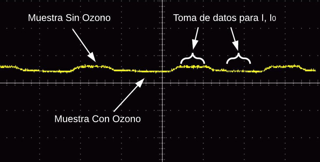 donde C O3 es la concentración de ozono en ppm. I la intensidad de la luz después de pasar por la muestra con ozono. I 0 la intensidad de la luz al pasar por una muestra sin ozono. P es la presión en hPa. T es la temperatura en ◦C y ( es el coeficiente de absorción del ozono a 254 nm (308 atm−1cm−1 a 273◦K y 1013 hPa).