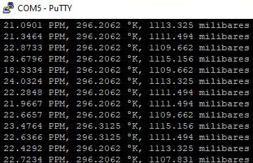El sistema entrega lecturas cada 2.4 segundos por medio de comunicación serial (Fig. 6), por lo cual puede leer cambios rápidos en la concentración de ozono y entregar la lectura de ese cambio, si se desea este tiempo puede reducirse, así como también se puede programar para realizar promedios cada determinado número de muestras.