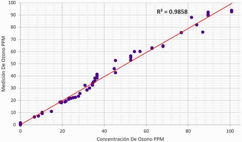 El prototipo diseñado presentó una sensibilidad de 0.01 ppm. La linealidad entre las mediciones de ozono fue confirmada con una correlación R 2 = 0.9858. En promedio, en todas las mediciones de la prueba se tuvo una precisión de ±2.5 ppm. Al superar las 100 ppm, el sistema dejo de detectar los aumentos de concentración, debido a que el ozono absorbió toda la luz UV presente en la celda y el fotodiodo no detectaba luz alguna.