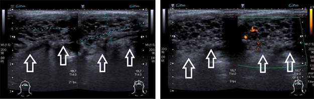 Figura 1: Ultrasonido Doppler color que muestra presencia tiroides ectópica de situación sublingual, múltiples imágenes hipoecogénicas redondeadas, Doppler color con flujo intralesional.