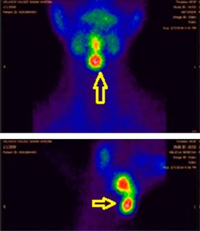 Se decidió realizar la gammagrafía con 99mTcO4-, ya que es el isótopo radioactivo de elección para gammagrafía tiroidea debido a que la radiación es menor, su vida media es de 6 horas y no interfiere en la fisiología tiroidea. Esto es diferente al usar yodo (I-131), que está indicado para el diagnóstico y tratamiento de hipertiroidismo, pues tiene una vida media de ocho días y puede provocar destrucción de las células de la glándula tiroidea.14,15