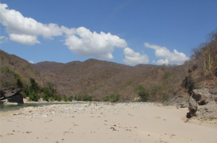 Figura 3 Río Tehuantepec, Oaxaca, México. Las dos imágenes superiores muestran el cambio en la vegetación entre la temporada seca y la lluviosa en la zona (A y B), las imágenes del medio señalan el contraste entre las secciones del río con la zona de playas arenosas (C) y la zona rocosa con pozas (D), y las imágenes inferiores señalan la diferencia del paisaje entre las maniobras de la construcción (E) y previo al proceso de la construcción (F). Créditos de fotografías A, B, C, D, y E: Gilberto Pozo-Montuy; Créditos de fotografía F: Ricardo Torres Flores.