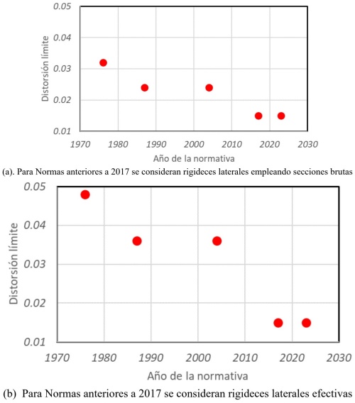 La Fig. 1 (a) muestra la variación en el tiempo de las distorsiones límites de estas normativas, misma que resume la Tabla 1. Estos resultados indican que en los 70s se permitía estructuras bastante flexibles, lo que empezó a cambiar después del terremoto del 19 de septiembre de 1985, en las normativas de 1987 y 2004, en las cuales las distorsiones límites fueron iguales a 75% de las especificadas en 1976, y se redujeron aún más a partir de 2017, con valores menores que el 50% de los especificados en 1976.