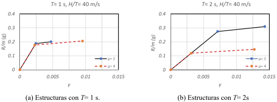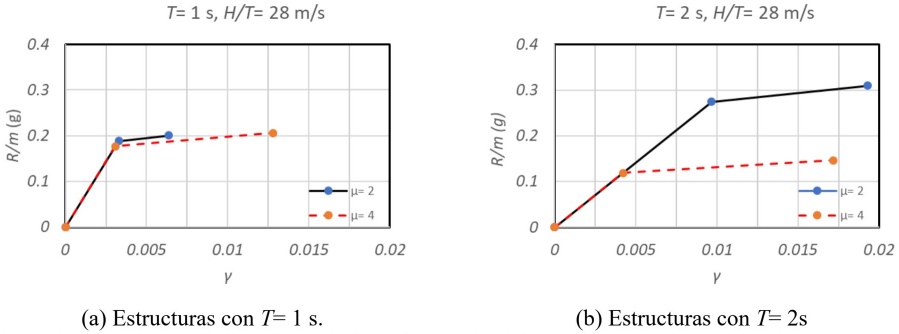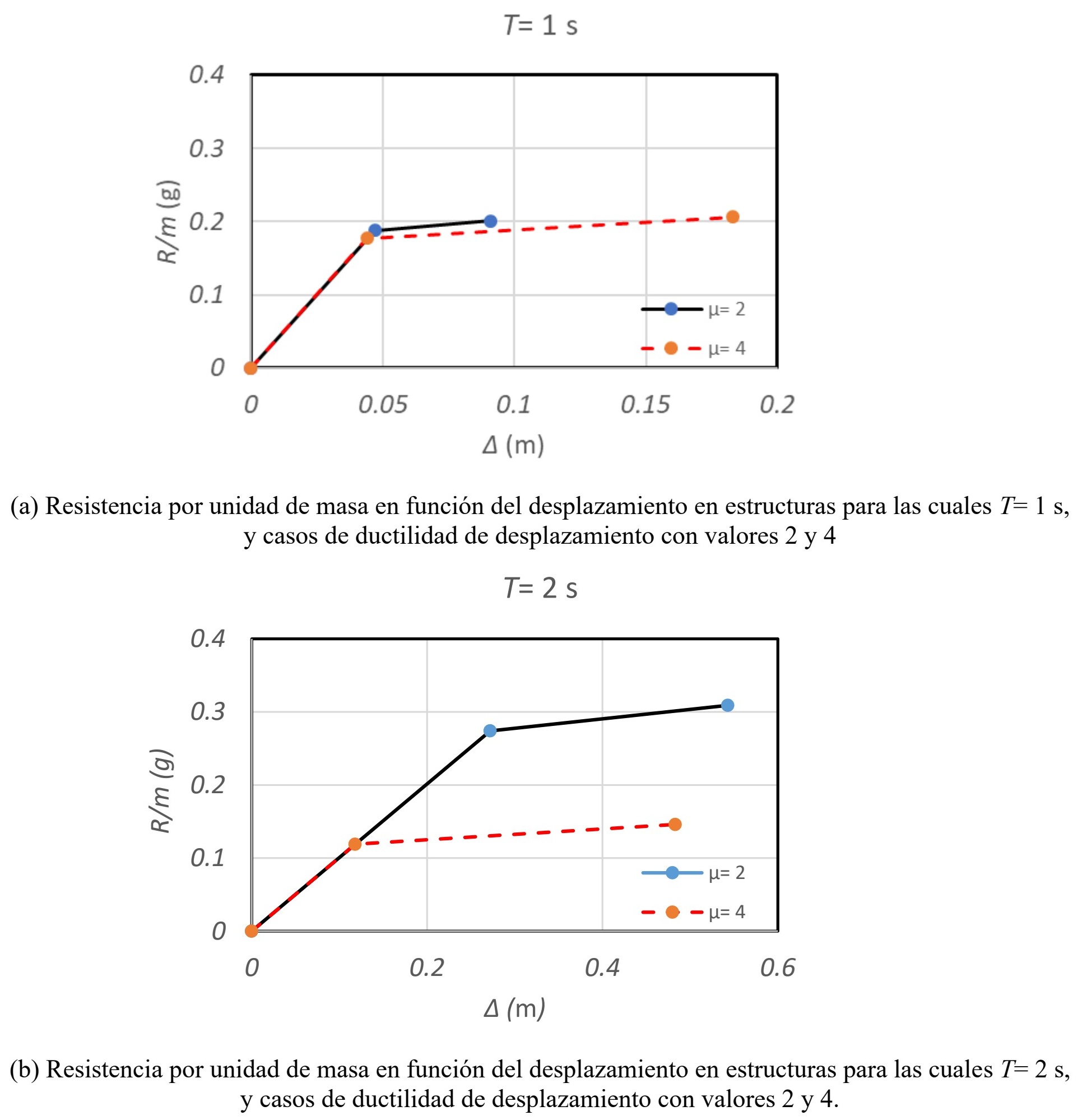 Empleando los resultados de los espectros de respuesta de la Fig. 7, la Tabla 4 muestra las resistencias de fluencia por unidad de masa, Ry/m, la resistencia espectral S a (mayor valor de R/m en la Fig. 6), y desplazamientos de fluencia y últimos, Δ y , y Δ u , respectivamente, para los casos de periodos iguales a 1 s y 2 s, y valores de ductilidad, μ, iguales a 2 y 4. Los valores de las resistencias que muestra la Tabla 4 corresponden a las necesarias para obtener las ductilidades objetivos, μ, iguales a 2 y 4 (Carr, 2011). Para emplear estos resultados en una interpretación de la Norma, en lo que sigue se considera de manera simplista que el factor de comportamiento sísmico, Q, y la ductilidad de desplazamiento, μ, tienen valores iguales.