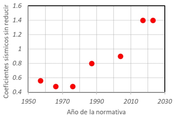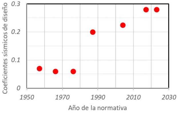 *Valor del coeficiente sísmico especificado por Normas, sin dividir (1957 y 1966), dividido por Q= 4 (1976), dividido por 2 (1987 y 2004), y dividido por Q’ R (2.5x2) (2017 y 2023).