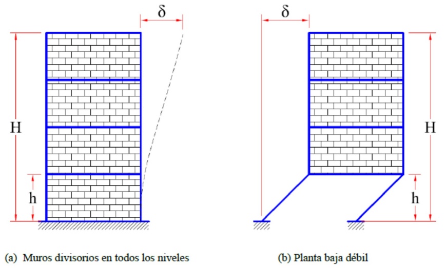 Figura 4 Desplazamientos laterales en edificios a base de marcos con muros divisorios en todos los niveles y con planta baja débil (Pujol y Rodriguez, 2019)