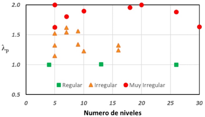 En la ec. (1), m 1/m T es la relación modal, donde m 1 se relaciona con la masa modal del primer modo, y m T es la masa modal total. En Restrepo et al. (2023) se describe el procedimiento para obtener la relación m 1/m T . En Restrepo et al. (2023) se estudia 23 edificios con diferentes números de niveles diseñados en México. Estos edificios se clasificaron según su irregularidad estructural de acuerdo con las NTCS 2017. Posteriormente se calculó el factor λ p para cada edificio empleando la ec. (1). La Fig. 5 (Restrepo et al., 2023) muestra estos resultados. De acuerdo con la Fig. 5, el factor de penalización λp es igual a 1 para estructuras regulares, en el caso de estructuras irregulares varía aproximadamente en el intervalo de 1.2 a 1.6, y en estructuras muy irregulares tiene valores en el intervalo de 1.6 a 2.