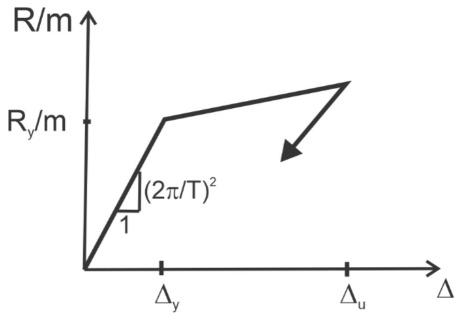 Se define algunos parámetros básicos que intervienen en la respuesta sísmica. La Fig. 6 muestra un ciclo inicial de la respuesta ante un sismo de una estructura de un grado de libertad (1GDL), en la que interviene la resistencia en la fluencia, R y , por unidad de masa, m, los desplazamientos de fluencia y último, Δy, y Δu, respectivamente, así como la rigidez definida como (2π/T) 2 , donde T es el periodo de la estructura. De la Fig. 6 se obtiene