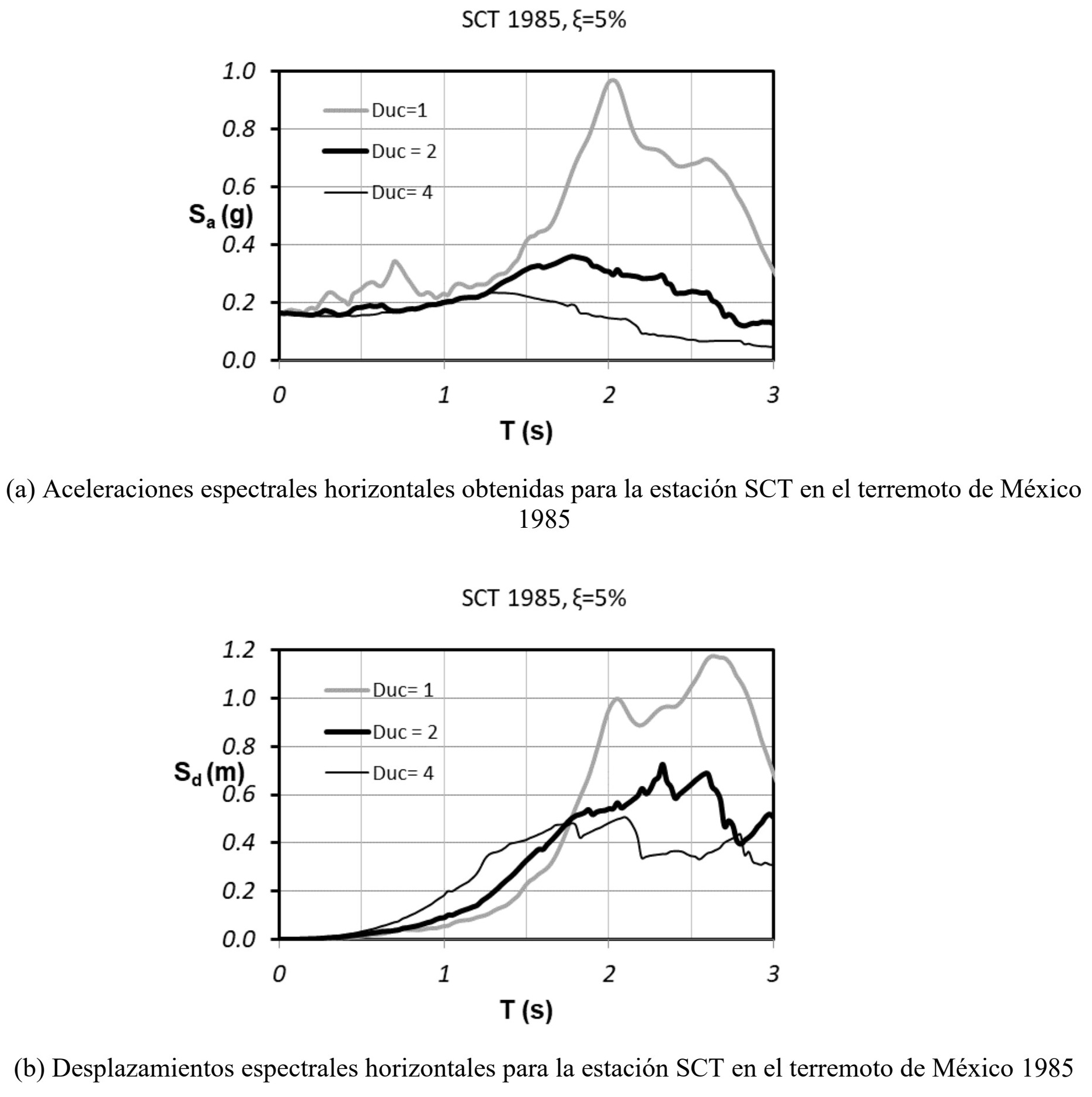 La Fig. 7 muestra las aceleraciones espectrales para el registro de aceleraciones del 19 de septiembre de 1985 en la estación SCT, considerando los casos de ductilidad de desplazamiento, μ, de la estructura, iguales a 2 y 4. Estos espectros de respuesta fueron obtenidos con el programa Ruaumoko (Carr, 2011), el cual permite evaluar la respuesta dinámica lineal y no lineal de una estructura, en este caso de 1 grado de libertad (1GDL). La fracción de amortiguamiento crítico, , que se empleó fue igual a 5%, con el fin de ser congruente con los valores de la fracción de amortiguamiento crítico implícito en los espectros de diseño de las normativas. Sin embargo, se debe mencionar que este valor para un análisis dinámico inelástico podría estar sobrestimado (Panagiotou, 2008; Martinelli y Filippou, 2009). Para representar el comportamiento inelástico de una estructura de concreto reforzado se empleó la regla de histéresis de Takeda modificado (Carr, 2011).