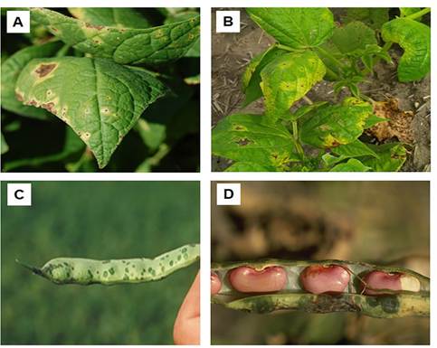 Figura 1 Síntomas producidos por P. syringae pv. phaseolicola en el frijol. A y B, Síntomas en las hojas. C y D, Síntomas en las vainas. Fuente: Adaptada de Schwartz, 2008; Harveson, 2009.