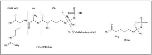 Desde el punto de vista químico, la estructura de la faseolotoxina es inusual y tiene dos componentes distintos: un residuo inorgánico, Nδ(N’-Sulfodiaminofosfinil) y un tripéptido, L-ornitil-alanil-homoarginina (Figura 2) (Arrebola et al., 2011). Esta toxina actúa como un inhibidor reversible de la enzima ornitina carbamoiltransferasa (OCTasa EC 2.1.3.3.), codificada por el gen argF. La OCTasa cataliza la conversión de ornitina y carbamoilfosfato a citrulina en la ruta de la síntesis