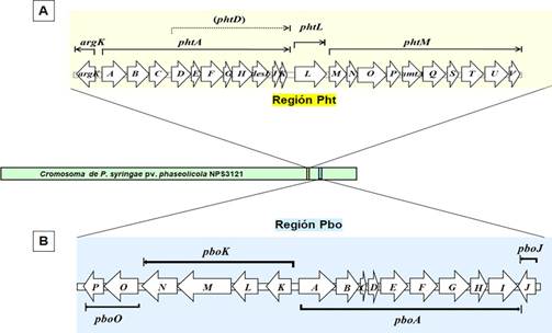Figura 3 Representación gráfica de las Regiones Pht y Pbo en el cromosoma de P. syringae pv. phaseolicola. A, Operones de la Región Pht. B, Operones de la Región Pbo. Cada flecha representa cada gen, la dirección de la flecha indica la dirección de la transcripción.