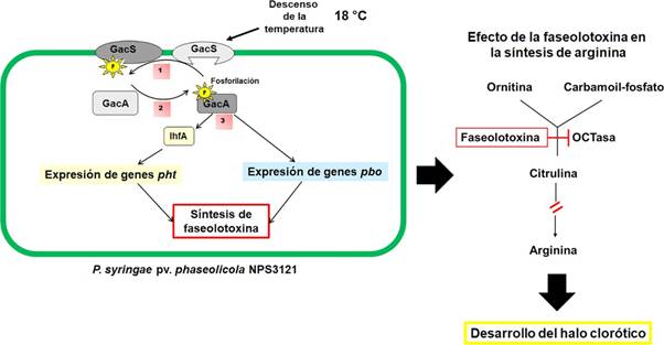 Figura 4 Modelo de señalización, regulación y efecto de la biosíntesis de la faseolotoxina producida por P. syringae pv. phaseolicola NPS3121. La temperatura se percibe por el sensor membranal GacS, que como consecuencia se autofosforila (1). GacS fosforilado transfiere el fosfato al regulador de respuesta GacA (2). GacA controla la expresión de los genes pht, mediada por el regulador IHF. GacA también controla la transcripción de los genes pbo 3). Finalmente, se sintetiza la faseolotoxina, que inhibe a la OCTasa del frijol, impidiendo la síntesis de arginina. Consecuentemente, se desarrolla el halo clorótico.