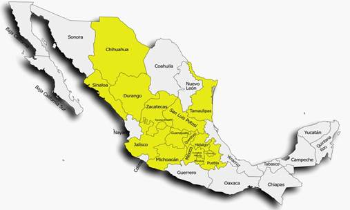 Figura 5 Mapa representativo de la distribución de P. syringae pv. phaseolicola en México. Los estados marcados con color amarillo indican la presencia de esta bacteria.