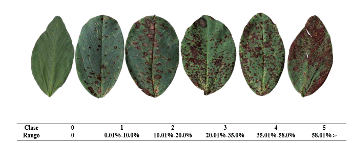 El valor mínimo de severidad observado fue del 0 % (foliolo sano) y el valor máximo de severidad de 58.1 % (Figura 1). Estos valores fueron fundamentales para determinar los límites de cada clase dentro de la escala. La escala de severidad construida tiene una serie de clases que contiene los rangos observables de la enfermedad y proporciona el comportamiento de la severidad de la enfermedad. Lo anterior concuerda con Campbell y Madden (1990), quienes definen que una escala de severidad debe estar compuesta por clases que representen los rangos observables de la enfermedad, proporcionando una resolución adecuada al comportamiento de la severidad.
